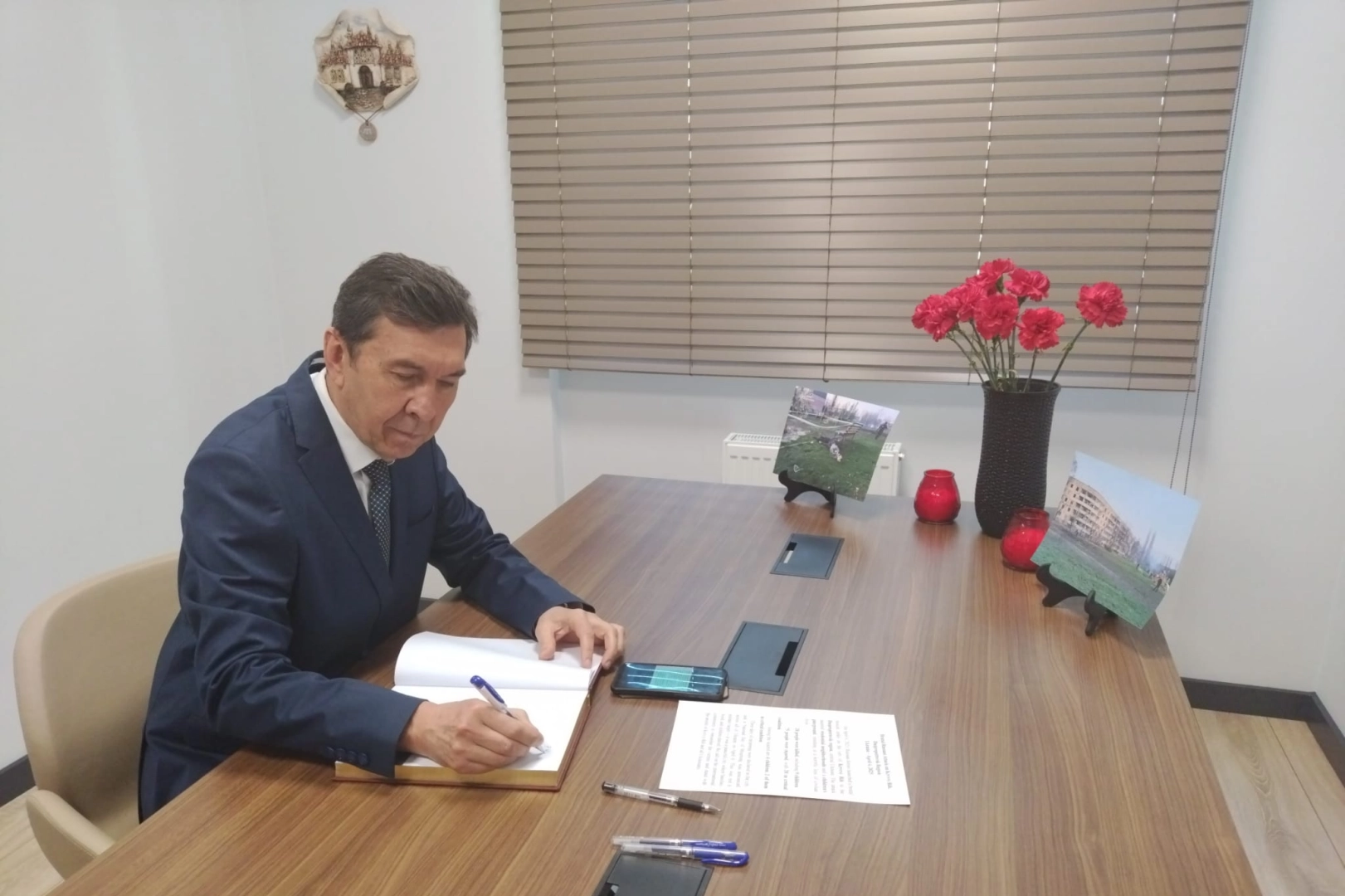 Kırım Türkleri Kültür ve Yardımlaşma Vakfı Başkanı Tuncer Kalkay, 7 Nisan 2025 tarihinde açılan taziye defterini imzalayarak, Rus teröründe hayatını kaybeden sivilleri andı.