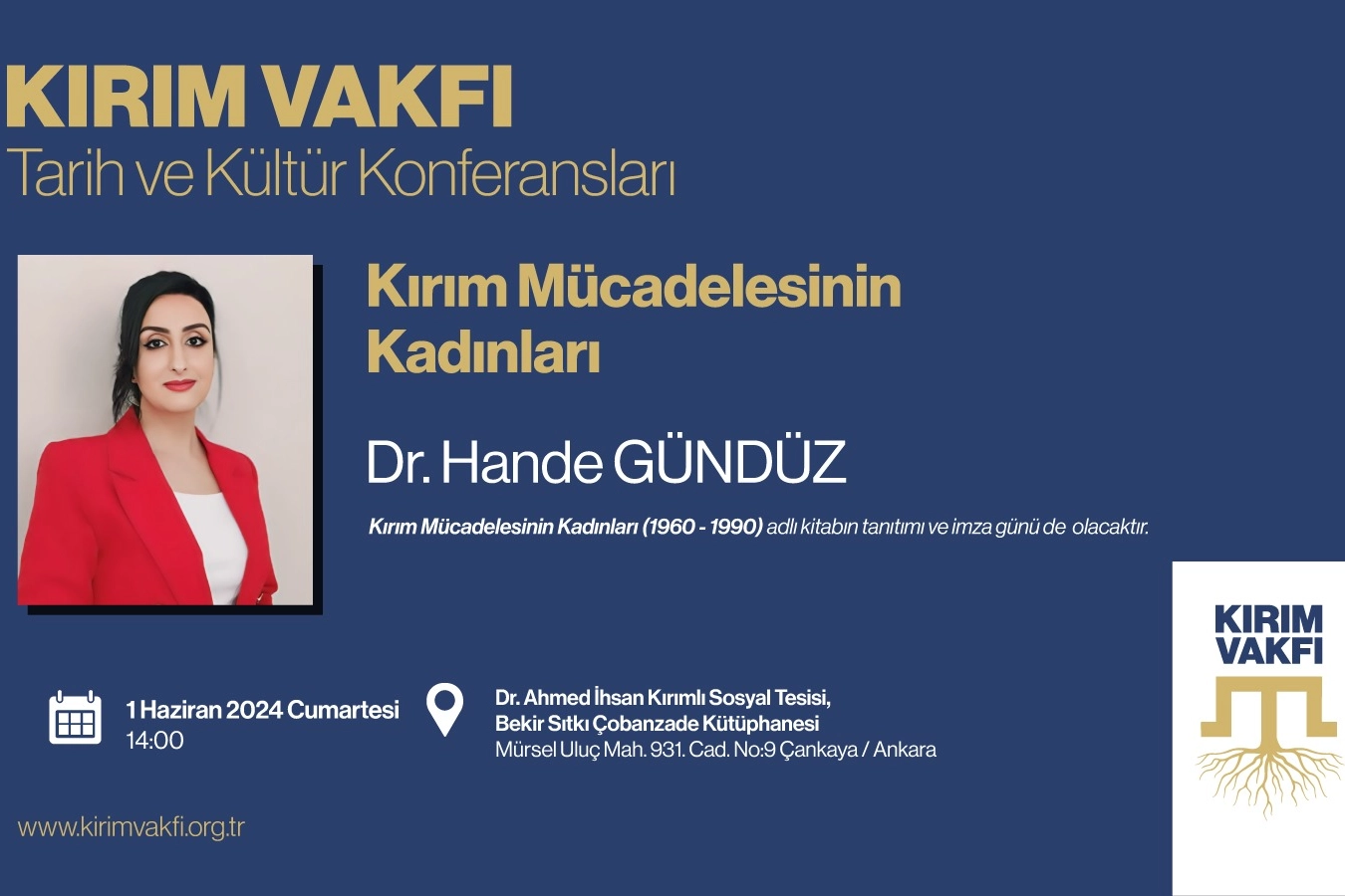 Kırım Vakfı tarafından geleneksel olarak düzenlenen “Tarih ve Kültür Konferansları” çerçevesinde, 1 Haziran 2024 Cumartesi günü Dr. Hande Gündüz'ün konuşmacı olarak katılacağı "Kırım Mücadelesinin Kadınları" konulu konferans düzenlenecek.