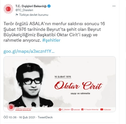 Lübnan'ın başkenti Beyrut'ta 16 Şubat 1976'da Ermeni terör örgütü ASALA mensuplarınca şehit edilen Türkiye'nin Beyrut Büyükelçiliği Başkatibi Oktar Cirit, şehadetinin 46. yılında anıldı. Büyükelçilikteki anma törenine, Beyrut Büyükelçisi Ali Barış Ulusoy ve elçilik personeli katılım gösterdi.