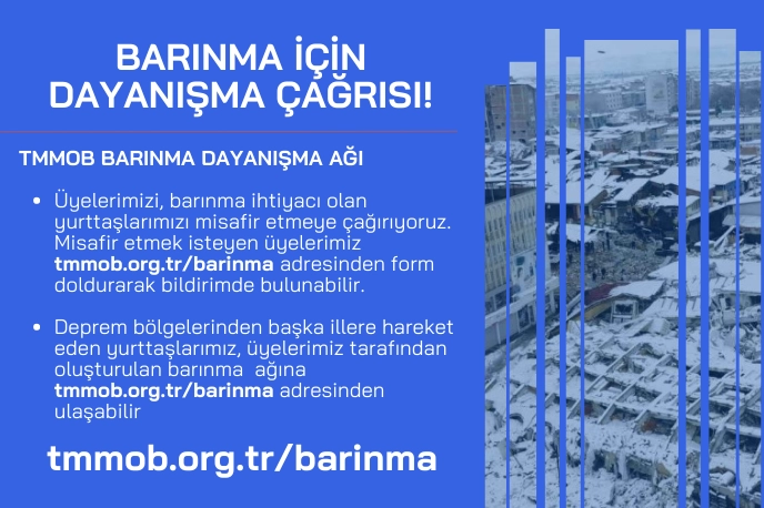 Türkiye'de depremden etkilenen ve barınma ihtiyacı olan yurttaşlar ile dayanışma için TMMOB ve üyeleri tarafından "TMMOB Barınma Ağı" oluşturuldu. TMMOB Barınma Ağına tmmob.org.tr/barinma adresinden ulaşabilirsiniz.