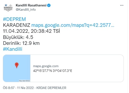 Kandilli Rasathanesi, Karadeniz açıklarındaki depremin yerin 12.9 km altında olduğunu açıklayarak, depremin büyüklüğünü de 4.5 olarak duyurdu.
