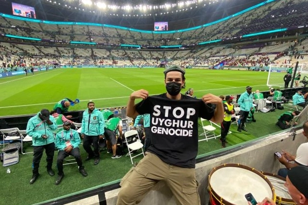 Çin’in Doğu Türkistan’da işlediği sistematik soykırım ve asimilasyon fiilleri her geçen gün dünya kamuoyunda daha fazla yer almaya başladı. Uygur Türkü bir aktivist, dünyanın merakla takip ettiği 2022 Katar Dünya Kupası’nda tek kişilik eylem yaptı. “StopUyghurGenocide” yazılı tişört ile stada giden aktivist, Doğu Türkistan’da soykırıma dikkat çekti.