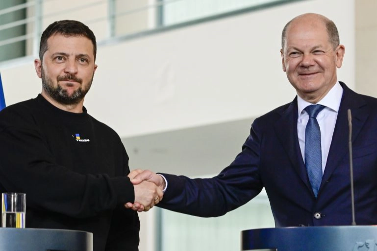 Almanya'nın başkenti Berlin'de Ukrayna Cumhurbaşkanı Volodımır Zelenskıy bugün resmi ziyaret çerçevesinde temaslarda bulunuyor. Almanya Başbakanı (Şansöyle) Olaf Scholz ve Ukrayna Cumhurbaşkanı Zelenskıy baş başa ve heyetler arası görüşme gerçekleştirdi. Ardından liderler, basın toplantısında konuştu. Taraflar, Ukrayna'ya yeni bir askeri yardım paketi tahsis edildiğini duyurdu.