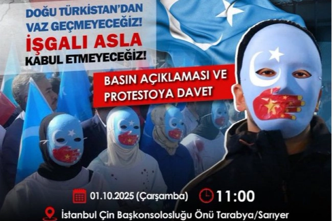 Çin’in Doğu Türkistan’ı işgalinin 76. yılında, Türkiye’deki Uygur diasporası İstanbul Çin Başkonsolosluğu önünde bir araya gelerek Pekin yönetiminin soykırım ve baskı politikalarını protesto edecek. 1 Ekim 2025 tarihinde düzenlenecek olan eylem, saat 11.00’de başlayacak.