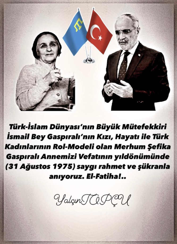Türkiye Cumhuriyeti Cumhurbaşkanı Başdanışmanı Yalçın Topçu, Türk dünyasındaki milli uyanış hareketlerinin öncüsü ve en büyük fikir adamlarından olan Kırım Tatarı İsmail Bey Gaspıralı'nın kızı ve en büyük yardımcısı, Türk kadın hareketinin öncüsü Şefika Gaspıralı’yı, vefatının 49. yılında yayımladığı anma mesajıyla yad etti.