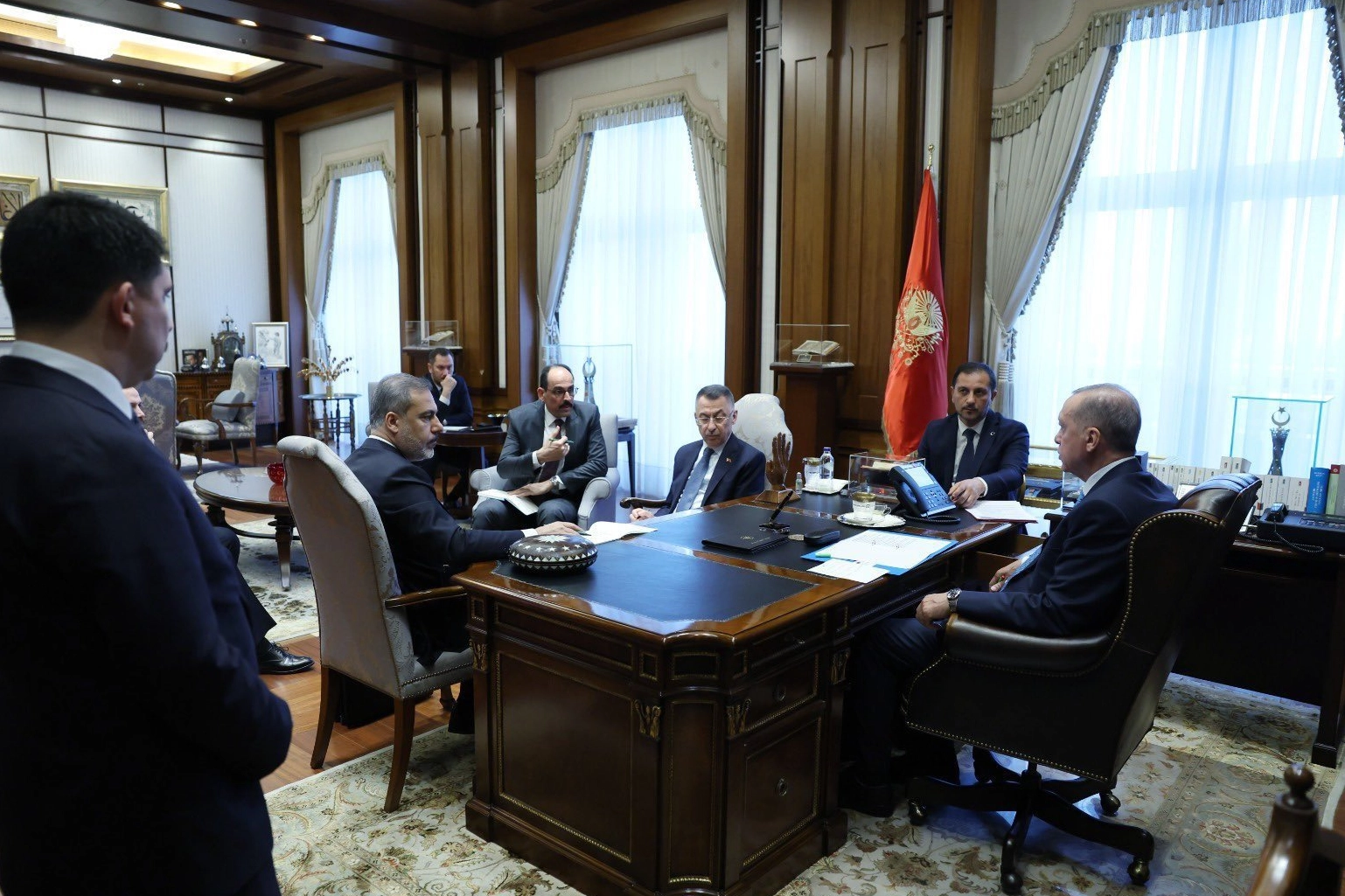 Görüşmede, Cumhurbaşkanı Yardımcısı Fuat Oktay, Cumhurbaşkanlığı Sözcüsü İbrahim Kalın ve MİT Başkanı Hakan Fidan da hazır bulundu. Türkiye Cumhuriyeti Cumhurbaşkanlığından görüşmeye ilişkin fotoğraf paylaşıldı.