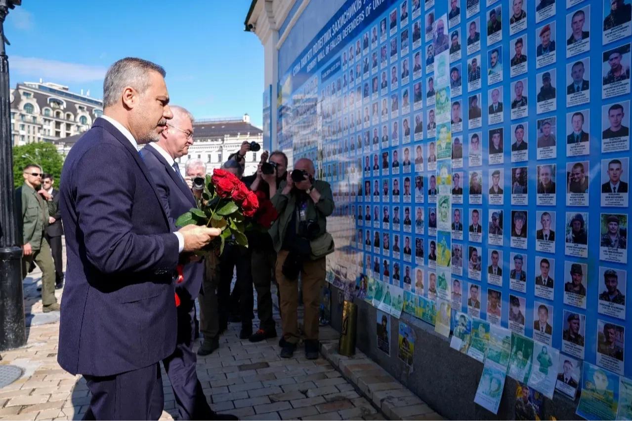 Fidan, Rus saldırılarında hayatını kaybeden Ukraynalı askerleri anısına oluşturulan Anma Duvarı’na çiçek bıraktı. Bakan Fidan’ı anma töreninin yapılacağı alanda Ukrayna Dışişleri Bakanı Andriy Sıbiha karşıladı.
