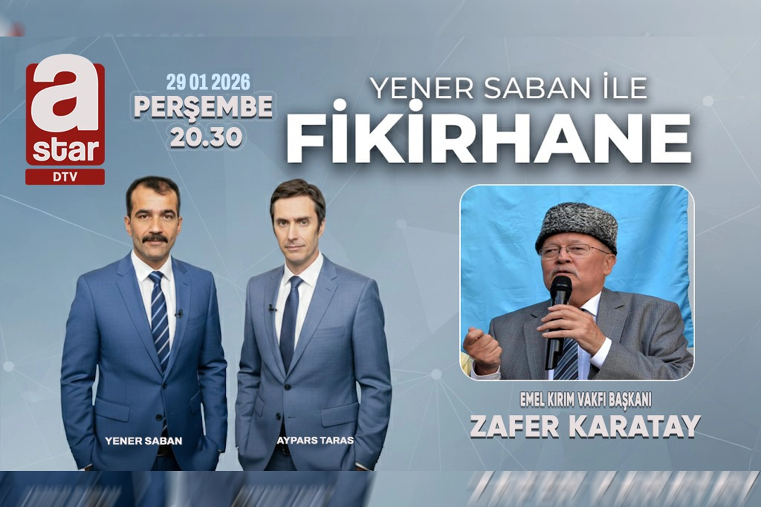 Kırım Tatar Milli Meclisi (KTMM) Türkiye Temsilcisi ve Emel Kırım Vakfı Başkanı Zafer Karatay, A Star DTV’de yayınlanan “Yener Saban ile Fikirhane” programına konuk olacak.
