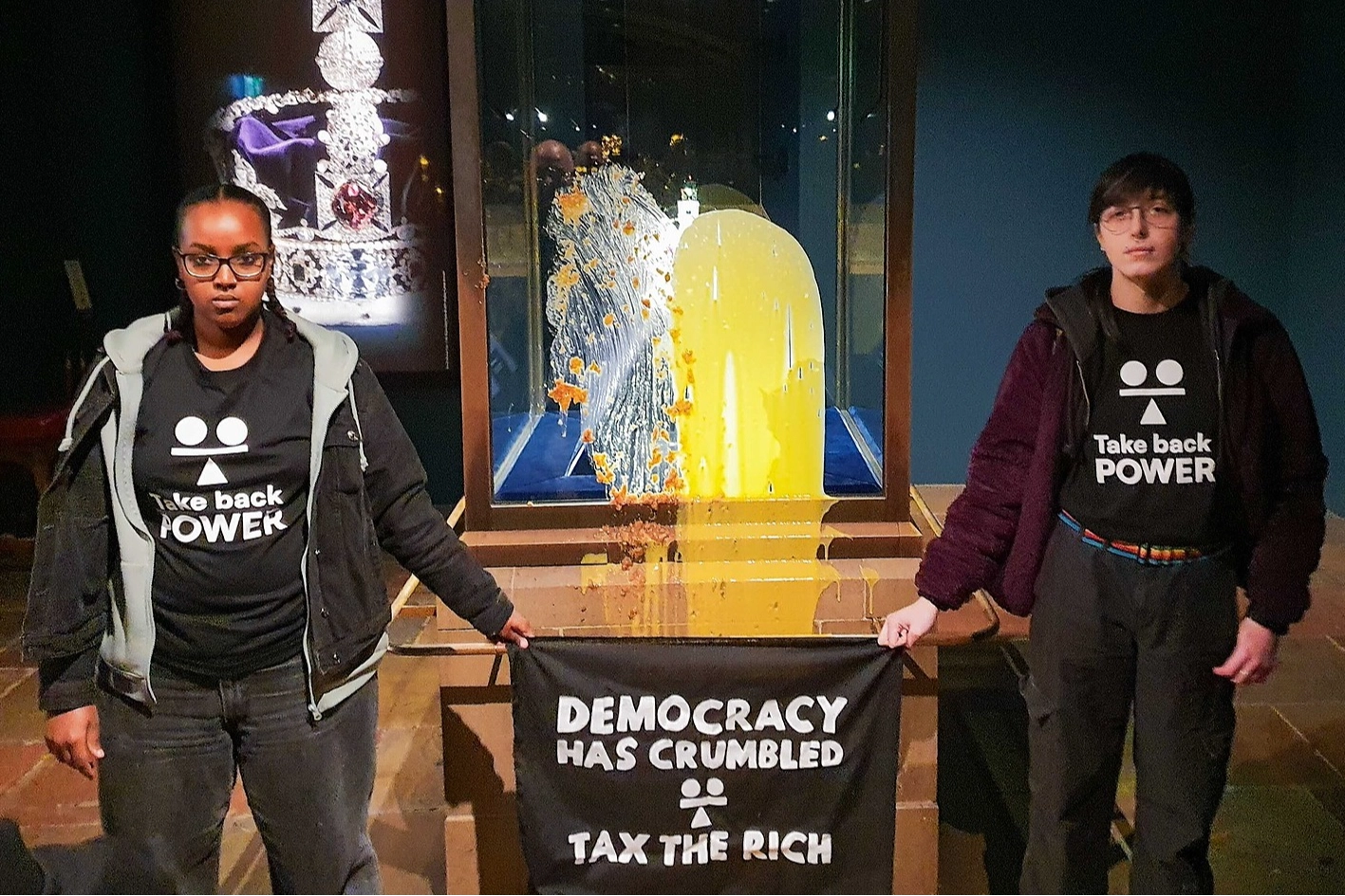Aşırı zenginlerden daha fazla vergi alınmasını ve "Halk Kamarası" isimli bir halk meclisi kurulmasını savunan grubun aktivistleri, tacın cam muhafazasına İngilizlerin ünlü tatlısı "apple crumble and custard" sürdü.