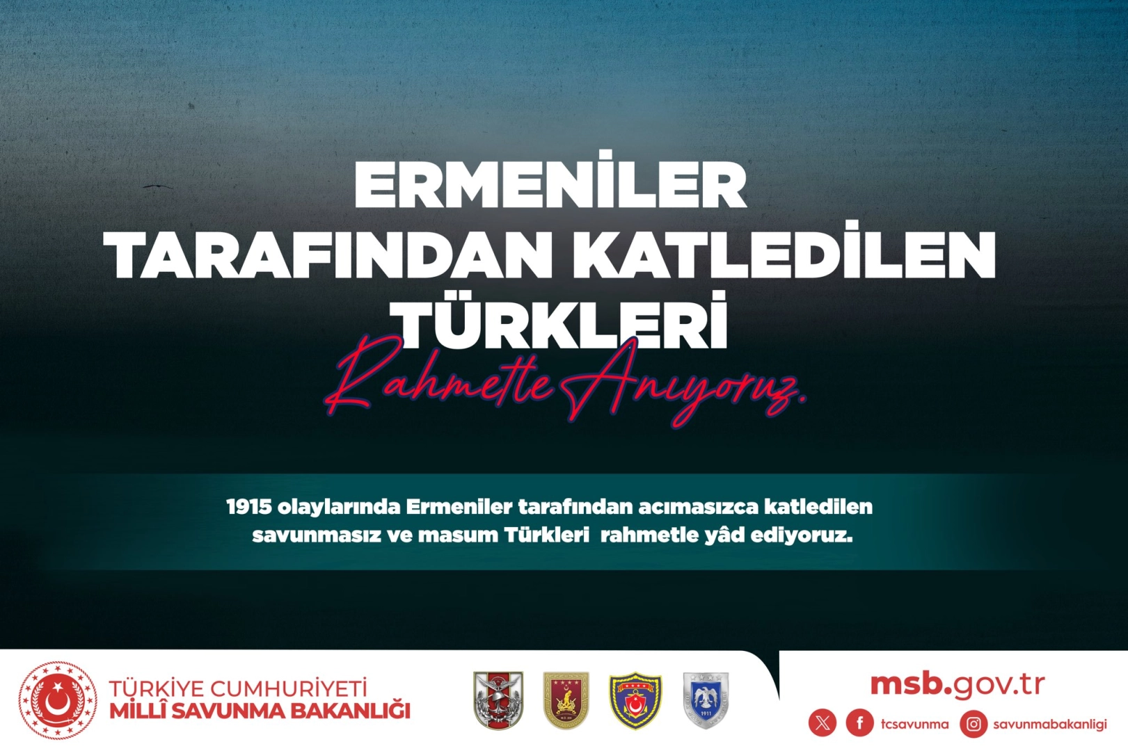 Türkiye Cumhuriyeti Millî Savunma Bakanlığının resmî sosyal medya hesabı üzerinden 24 Nisan 2026 tarihinde yayımlanan paylaşımda, 1915 Olayları esnasında Ermeniler tarafından katledilen Türkler anıldı.