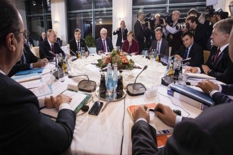 Fransa Cumhurbaşkanı François Hollande, Almanya Başbakanı Angela Merkel, Rusya Devlet Başkanı Vladimir Putin ve Ukrayna Devlet Başkanı Petro Poroşenko, Ukrayna'nın doğusundaki krize çözüm bulmak amacıyla, 19 Ekim tarihinde Normandiya Formatında Almanya'nın başkenti Berlin'de bir araya geldi. Ukrayna Cumhurbaşkanlığı sitesinde yapılan açıklamada, Normandiya Formatı ülkelerinin liderlerinin Minsk Anlaşmalarını hayata geçirecek “yol haritasını” hazırlanmasının üzerinde anlaştığı bildirildi. Açıklamaya göre Berlin’de yapılan toplantıdan sonra gazetecilere konuşan Ukrayna Cumhurbaşkanı Petro Poroşenko, günümüzde Normandiya formatının herhangi bir alternatifinin olmadığını ve yapılan görüşmede bunun belirtildiğini kaydetti. Poroşenko, “Günümüzde Minsk Anlaşmaları bütünsel bir belge ve söz ettiğimiz 'yol haritası' tutarlılık ve garantileri öngörüyor” dedi. Cumhurbaşkanı Poroşenko, “yol haritasının” öngördüğü güvenlik şartlarının, ateşkes, yabancı orduların geri çekilmesi, askeri araçların geri çekilmesi rejimine uyulması, AGİT temsilcilerinin bölgeye engelsiz erişiminin sağlanması, rehinelerin serbest bırakılması şartlarının yerine getirilmesinden sonra haritanın siyasi kısmının uygulanmasına geçmek mümkün olacağını ekledi. “Yol haritasının” Minsk Anlaşmaları çerçevesinde kabul edilen tüm belgelerin hayata getirilmesine yönelik bir belge olduğunu vurgulayan Petro Poroşenko, dışişleri bakanlarına Kasım ayı sonuna kadar yol haritasının temelini onaylama görevi verildiğini belirtti. “Söz konusu belgenin içermesi gerektiği esas yönleri belirledik” ifadesini kullanan Poroşenko, önümüzdeki ayda dışişleri bakanlarının bir araya gelerek Normandiya formatında yapılacak bir sonraki görüşmenin hazırlanması için sonuçları ele alacağını bildirdi. İşgal edilen Donbas’ta polis misyonu faaliyete başlayacak Yapılan görüşme esnasında Ukrayna’nın Donetsk ve Lugansk bölgelerinin işgal altında olan kesimlerinde polis misyonunun faaliyet göstereceği konusunda anlaşmaya varıldığını bildiren Ukrayna Cumhurbaşkanı Poroşenko, “Kimsenin AGİT faaliyetlerini engellemeyeceğinde anlaştık. Güvenlik şartları seçimleri düzenleme olanağını sağladığı zaman yapılacak yerel seçimler için hazırlıkların ve çalışmaların yapılmasının sağlanması için yapılıyor. Şimdi Donbas’a polis misyonu olarak adlandırdığımız silahlı AGİT misyonunun gönderilmesi girişimde bulunuyoruz. Söz konusu misyon seçim sürecinin güvenliğini ve geçiş süreci devamında güvenliği sağlayacak” dedi. Rusya’nın ilgili teklifi desteklediğini ifade eden Poroşenko, “Rusya tarafının silahlı AGİT polis misyonunun gönderilmesini desteklediğini ayrı olarak vurgulayabilirim” şeklinde konuştu. Bununla birlikte Berlin’de yapılan görüşmede, Donbas’ta yapılacak seçimlerin tarihinin ele alınmadığını belirten Poroşenko, “Seçimlerin tarihinden şimdilik söz edilmiyor. Şimdi bir yol haritasının hazırlanacağı ve bu belgenin çerçevesinde seçimlerin yapılabileceğinden söz ediyoruz” diye kaydetti. Rehinelerin serbest bırakılması görüşüldü Görüşmede ele alınana konulardan birinin de, Ukrayna’nın işgal edilen topraklarında ve Rusya’da yasadışı olarak tutuklu bulunan Ukraynalı rehinelerin serbest bırakılması ile ilgili olduğunu dile getiren Petro Poroşenko, “Tüm rehinelerin 'herkese herkes' formatında hemen serbest bırakılmasını talep ediyoruz ve bunun, Rusya tarafının eylemsizliğinden dolayı uzun süre için durdurulan süreç için bir ivme olacağı kanaatindeyim” diyerek Ukrayna’nın, Uluslararası Kızılhaç Komitesi temsilcilerinin yasadışı olarak tutuklu bulunan rehinelere erişiminin sağlanması ile ilgili teklifinin desteklendiğini ekledi. Fransa ve Almanya: Rusya’ya ek yaptırımlar uygulanabilir Fransa Cumhurbaşkanı François Hollande ve Almanya Başbakanı Angela Merkel, Berlin’de yapılan görüşme sırasında, Suriye’deki saldırıları yüzünden Rusya’yı kınadı ve Kremlin’e karşı yaptırım uygulanması ihtimalini iptal etmeyi reddetti. Görüşmeden sonra gazetecilere konuşan François Hollande, “Halep’teki olaylar, askeri suçtur. En öncelikli taleplerden biri, Esad ve (Rus) koruyucuları tarafından gerçekleştirilen saldırılar durdurulmalı” diye kaydetti. Angela Merkel, Halep’e yapılan saldırıların “insanlık dışı ve şiddetli” olduğunu belirtti. Almanya ve Fransa liderleri Rusya’ya karşı yaptırım uygulanması ihtimalinin olduğunu belirtti. Hollande, “Tehdit oluşturabilecek her şey yararlı olabilir” derken Merkel, “Bu seçeneği göz ardı edemeyiz” şeklinde konuştu. Rusya Devlet Başkanlığı’ndan açıklama Rusya Devlet Başkanlığı’ndan da Berlin’de yapılan görüşme ile ilgili açıklama yapıldı. Açıklamaya göre Rusya Devlet Başkanı Vladimir Putin, “Görüşmede güvenlik konularına büyük dikkat verildi ve yakın zaman, çatışma taraflarının geri çekilmesi ile ilgili meselelerin çözülmesi için yapılması gereken birçok konuda anlaşmaya varıldı. Bu çalışmaların devam ettirilebileceği noktaları ve yerleri seçmeye devam edeceğimizde anlaştık” dedi. AGİT polis misyonu ile ilgili olarak Putin, “Askerin geri çekildiği bölgelerde ve ağır araçların bulunduğu noktalarda AGİT misyonunun genişletilmesine hazır olduğumuzu tasdik ettik” diye belirtti. Ukrayna’nın Donetsk ve Lugansk bölgelerinin işgal altındaki kesimlerinin özel statüsü konusuna değinen Rus Devlet Başkanı Putin, “Lugansk ve Donetsk illerinin ayrı bölgelerinin özel statüsü ile ilgili anlaşmanın hayata geçirilmesinin düzenine ilişkin nihai anlaşmalar konuları dahil olmak üzere siyasi al