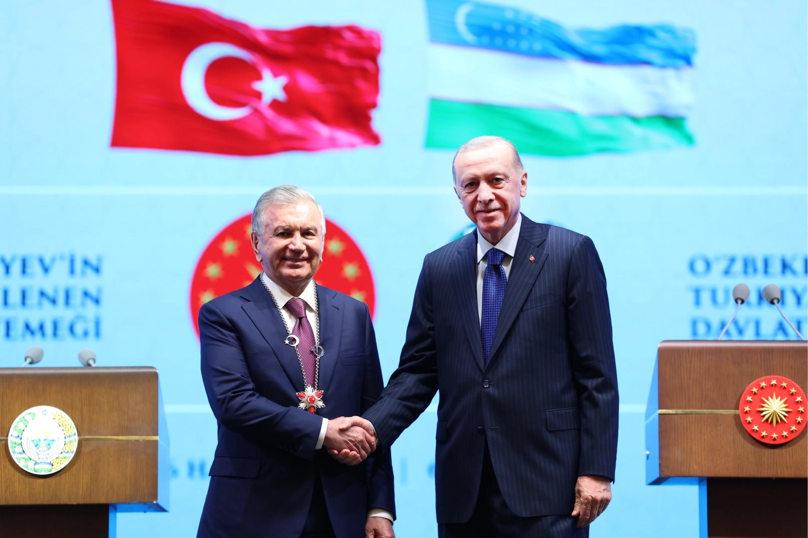 Özbekistan Cumhurbaşkanı Şevket Mirziyoyev, Cumhurbaşkanı Erdoğan tarafından kendisine Devlet Nişanı tevcih edilen Mirziyoyev, Cumhurbaşkanı Erdoğan ve "Türk dostlarıyla" bir arada bulunmaktan duyduğu heyecanı ve mutluluğu dile getirerek "Bugün devletlerimiz arasındaki ilişkilerde tam anlamıyla tarihi bir gün." dedi.