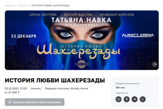 Kazakistan merkezli bilet satış sistemi Top Bilet, 15 Eylül 2023 tarihinde planlanan Kremlin Sözcüsü Dmitri Peskov’un eşi Tatyana Navka'nın "Şeherazade'nin Aşk Hikayesi" buz pateni gösterisinin bilet satışını Kazakistan'da askıya alındığını duyurdu. Gösterinin iptaline ilişkin herhangi bir neden belirtilmedi.