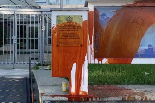 Rusya’nın 8 Temmuz 2024 tarihinde Ukrayna’ya yönelik şiddetli saldırılarını kınamak amacıyla Prag'daki Rus Büyükelçiliğine kırmızı boya döküldü.