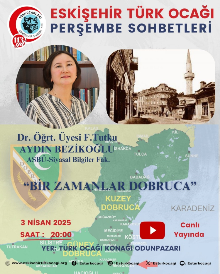 Türk Ocakları Eskişehir Şubesi tarafından düzenlenen “Perşembe Sohbetleri” çerçevesinde, Ankara Sosyal Bilimler Üniversitesi Siyaset Bilimi ve Kamu Yönetimi Bölümü Dr. Öğr. Üyesi Filiz Tutku Aydın Bezikoğlu'nun konuşmacı olarak katılacağı "Bir Zamanlar Dobruca" konulu konferans düzenlenecek.