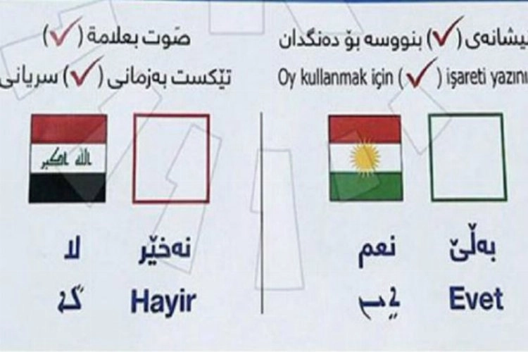 Erbil merkezli bir uydudan yayın yapan Rudaw Tv’nin haberine göre Irak Bölgesel Kürt yönetiminin 25 Eylül’de yapacağını duyurduğu bağımsızlık referandumu için Yüksek Seçim Kurulu tarafından seçim pusulaları hazırlandı. Arapça, Kürtçe ve Türkçe dillerinin kullanıldığı oy pusulasında, "Kürdistan bölgesel Yönetimi ve tartışmalı bölgeleri de içerisine alan bir bağımsız Kürdistan devletinin kurulmasını istiyor musunuz?" deniliyor. Pusulanın altında merkezi Irak hükümetinin bayrağının bulunduğu bölgeye, 'Hayır', Irak Bölgesel Kürt yönetimi bayrağının bulunduğu bölgeye de 'Evet' işareti konuldu.