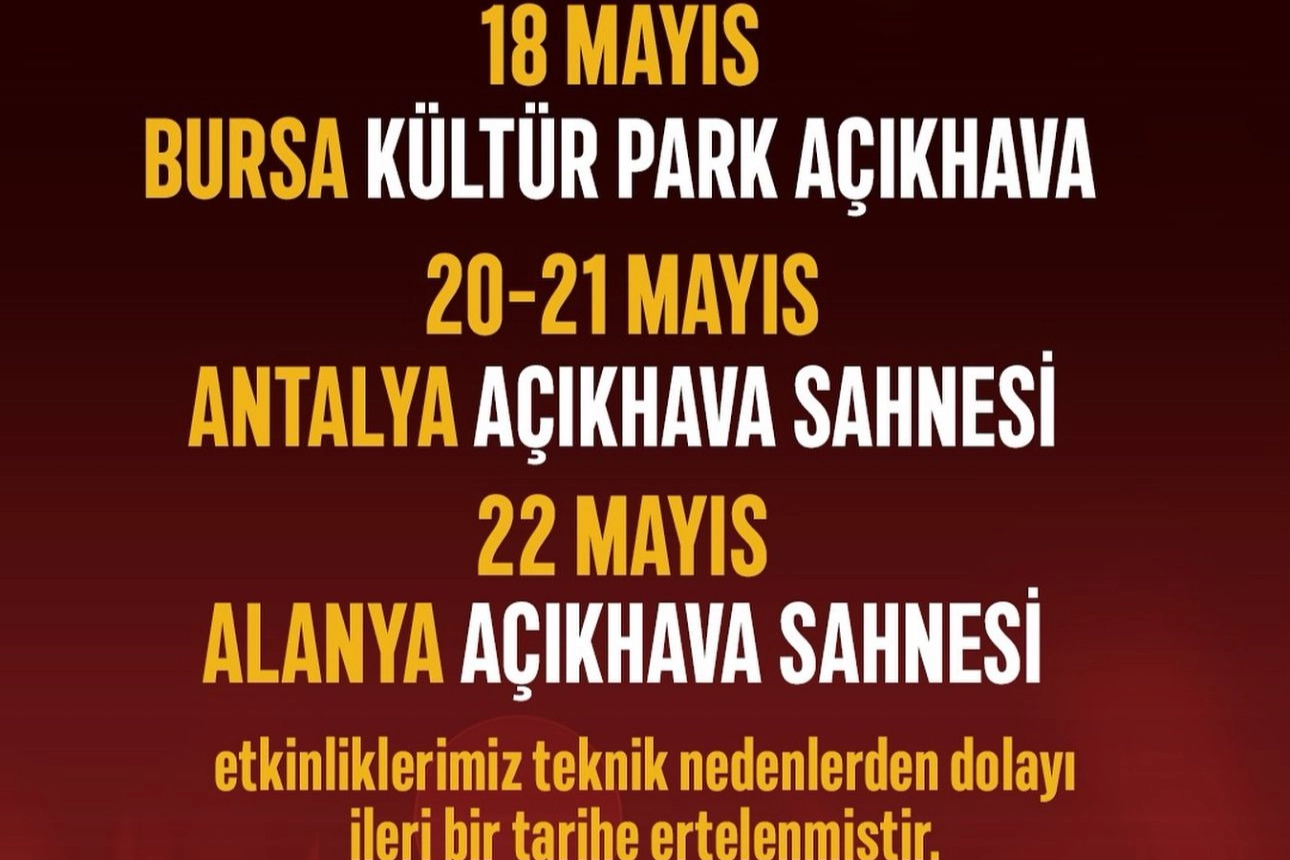 Türkiye turnesinin organizasyonunu üstlenen ISF Sanat şirketi, konuya ilişkin olarak yaptığı açıklamada, "18 Mayıs Bursa Kültür Park Açık Hava, 20-21 Mayıs Antalya Açıkhava Sahnesi, 22 Mayıs alanya Açıkhava Sahnesi etkinliklerimiz teknik nedenlerden dolayı ileri bir tarihe ertelenmiştir" ifadelerine yer verdi.