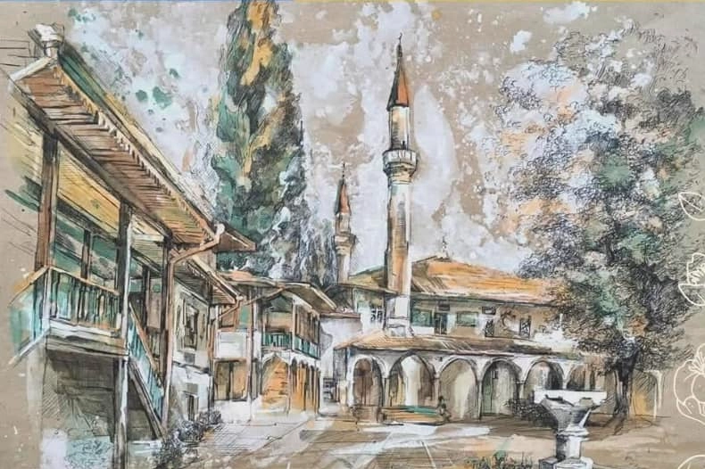 Bahçesaray'da bulunan Büyük Han Camii'nin bir çizimi ile birlikte yapılan paylaşımda şu ifadelere yer verildi:
