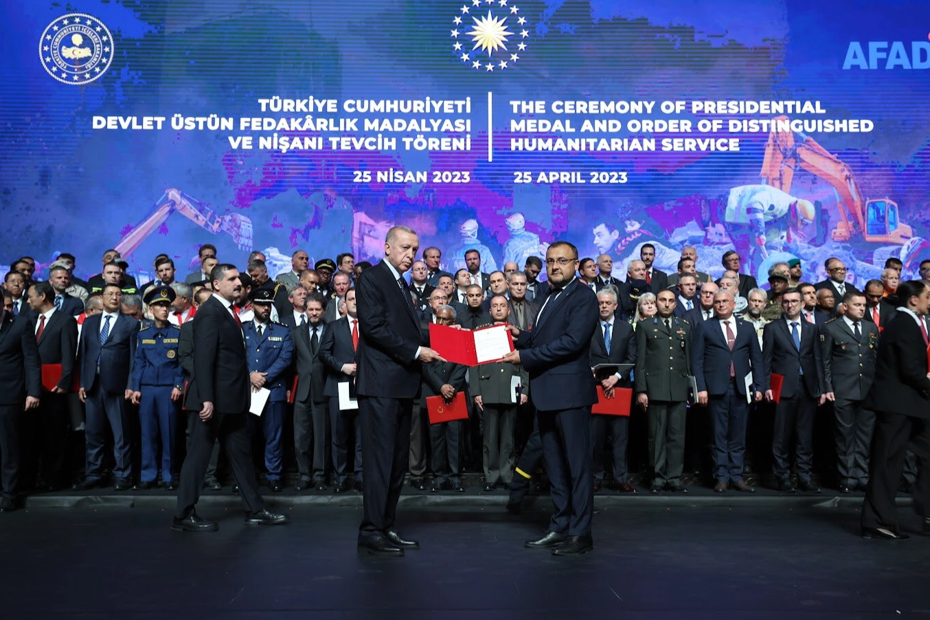 Beştepe Cumhurbaşkanlığı Külliyesi'nde bugün 6 Şubat depremlerinde fedakârlık gösteren yerli ve yabancı arama kurtarma ekiplerine Devlet Üstün Fedakârlık Madalyası ve Nişanı Tevcih Töreni gerçekleşti. Törene, Cumhurbaşkanı Recep Tayyip Erdoğan da katıldı ve bazı ödülleri Erdoğan bizzat takdim etti.