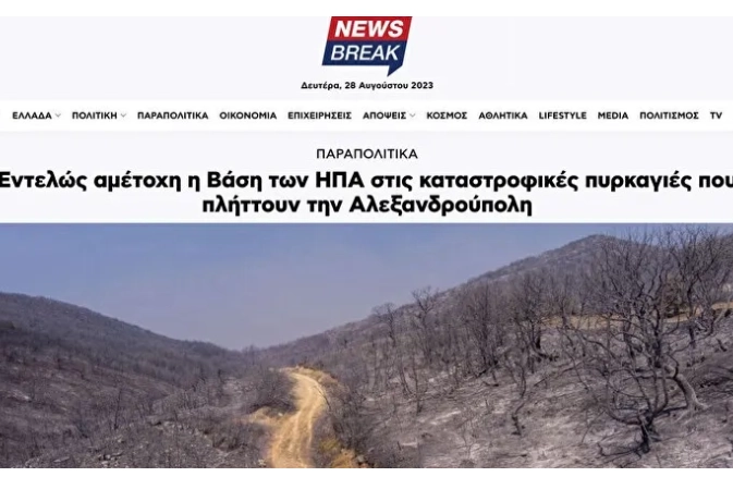 Yunanistan, haftalardır devam eden orman yangınlarıyla mücadele ediyor. Yunan medyası, Yunanistan'da günlerdir söndürülemeyen orman yangınlarına ilişkin tepki içeren bir paylaşımda bulundu. Yunanistan, Dedağaç ve Meriç bölgesinde askeri üs kuran ABD'yi eleştiri yağmuruna tuttu. Yunan medyasından News Break, ABD'nin orman yangınları konusunda harekete geçmemesine tepki gösterdi.