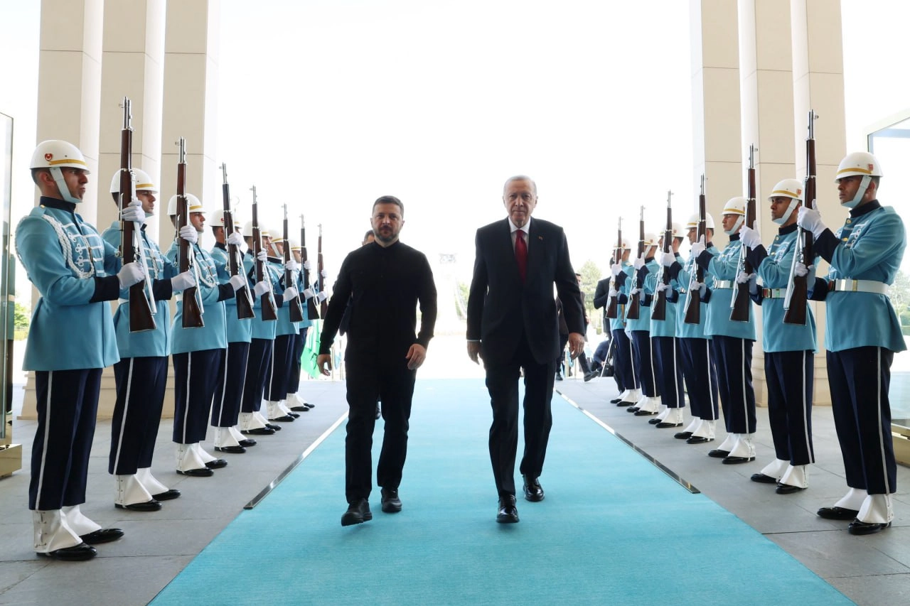 Türkiye Cumhuriyeti Cumhurbaşkanı Recep Tayyip Erdoğan, Ukrayna Cumhurbaşkanı Volodımır Zelenskıy'ı başkent Ankara'daki Cumhurbaşkanlığı Külliyesi giriş kapısında karşıladı.