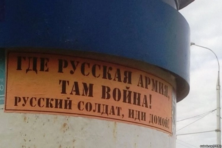 Belarus’un Brest şehrinde “Batı- 2017” askeri tatbikat için ülkeye gelen Rus askerleri: “Rus ordusunun olduğu yerde savaş var!”, “Rus askeri evine dön!” yazılı posterlerle karşılaşıyor.