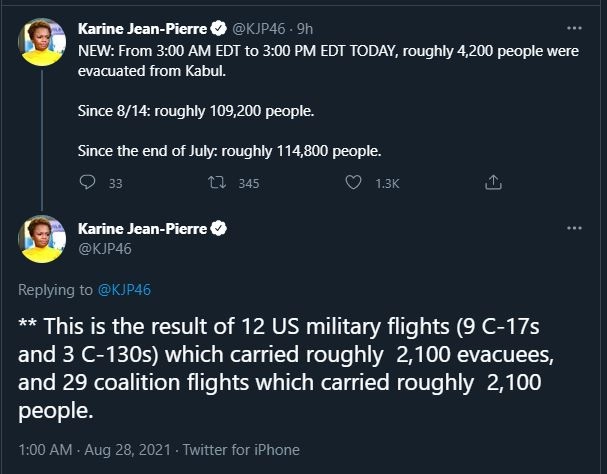 Beyaz Saray Sözcü Yardımcısı Karine Jean-Pierre, sosyal medya hesabından yaptığı açıklamada, 28 Ağustos 2021 itibarıyla son 12 saatte Kabil'deki Hamid Karzai Uluslararası Havalimanı'ndan yaklaşık 4 bin 200 kişiyi daha ülkeden çıkardıklarını, 12 ABD askeri uçuşu ile 2 bin 100, 29 koalisyon uçuşuyla 2 bin 100 kişinin tahliye edildiğini bildirdi.