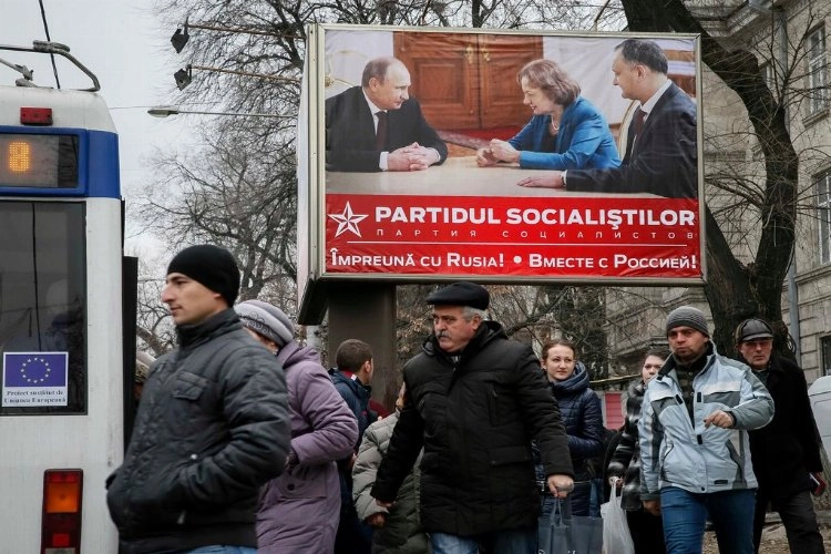 Moldova’nın Kişinev kentinde 2014 yılında yapılan bir seçim tabelası, Putin ile birlikte Avrupa karşıtı Sosyalist Parti’nin temsilcilerini (bir arada) gösterdi.