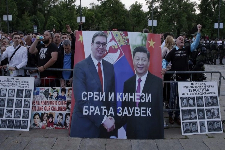 (Sırbistan'da hükumet yanlısı destekçiler, Belgrad'da Sırbistan Cumhurbaşkanı Aleksandar Vucic'in Çin Devlet Başkanı Şi Jinping ile el sıkışan dev fotoğrafının önünde sloganlar atıyor. Haziran 2020.)