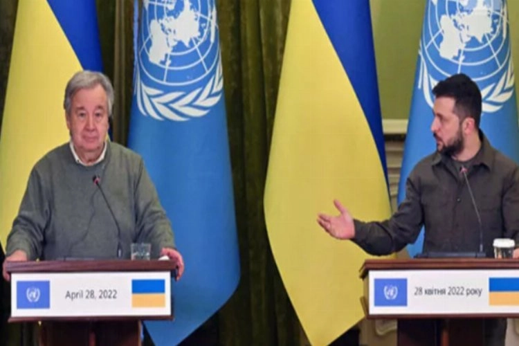 Birleşmiş Milletler (BM) Genel Sekreteri Antonio Guterres, resmî ziyaretlerde bulunduğu Kıyiv'de 28 Nisan 2022 tarihinde, Ukrayna Cumhurbaşkanı Volodımır Zelenskıy ile görüşmesinin ardından beraber basın toplantısı düzenledi.