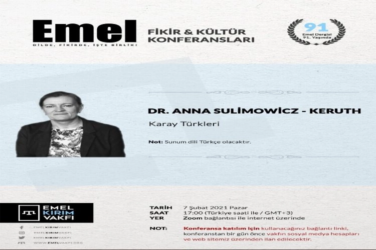 Emel Fikir Kültür konferansları kapsamında bu hafta, "Karay Türkleri" başlığı ele alınacak. Dr. Anna Sulimowicz-Keruth’in konuşmacı olarak katılacağı konferans, 7 Şubat 2021 Pazar günü saat 17.00’de Zoom üzerinden Türkçe gerçekleştirilecek.
