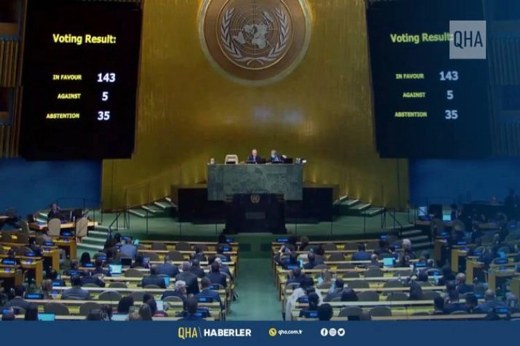 ABD’nin New York şehrinde dün düzenlenen Birleşmiş Milletler Genel Kurulunda (BMGK) oylamaya sunulan "Ukrayna'nın Toprak Bütünlüğü: BM Şartı İlkelerinin Korunması” başlıklı karara BM üyesi 193 ülkeden 143’ü Ukrayna’ya destek verdi. Karara, yalnızca işgalci Rusya ve destekçileri; Belarus, Suriye, Kuzey Kore ve Nikaragua karşı çıktı. 35 ülke ise karara çekimser kaldı.