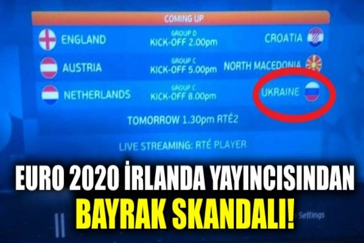 EURO 2020 İrlanda resmi yayıncısı, EURO 2020 fikstürünü yayımlarken kışkırtıcı bir skandala imza atıldı. EURO 2020 İrlanda resmi yayıncısı olan İrlanda televizyonundan Ukrayna maçı duyurusu için Rusya bayrağı kullanıldı.