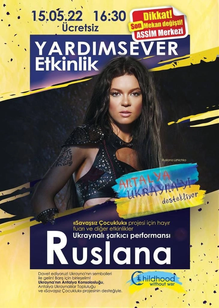 Antalya’da bugün saat 16:30'da Assım Merkezi'nde, Rusya’nın 24 Şubat'tan bu yana aralıksız saldırıları altındaki Ukrayna'ya ve Ukrayna halkına destek için konser etkinliği düzenlenecek. Ünlü Ukraynalı sanatçı, Eurovision 2004 birincisi olan Ruslana, bağış kampanyasına destek için ücretsiz konser verecek.