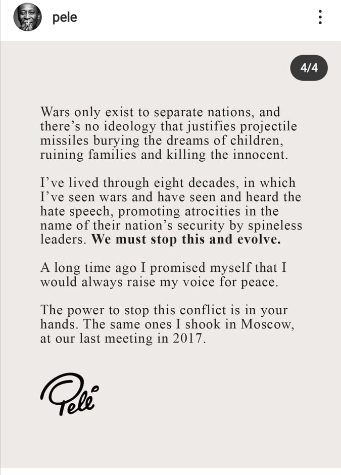 Futbolun efsane ismi, "Siyah İnci", "Futbolun Kralı", "Kral Pele" olarak da tanınan Pele, Ukrayna'ya karşı açtığı savaşı üç aydır sürdüren Rusya Devlet Başkanı Vladimir Putin'e barış çağrısında bulundu.