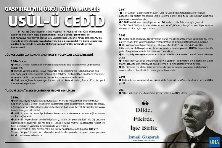 24 Kasım Öğretmenler Günü vesilesi ile, Gaspıralı’nın Türk dünyasının kaderine etki eden öncü eğitim modeli “Usûl-ü Cedid” de hatırlanmayı hak ediyor. İsmail Bey Gaspıralı’nın, 1884’te Kırım, Bahçesaray’da mahalle mekteplerinde uyguladığı yeni bir eğitim modeli, kısa sürede devrin Çarlık Rusya’sındaki Türkler arasında yayılıp benimsendi. “Usûl-ü Cedid” yani “Yeni Usûl” olarak anılan bu eğitim modelini Türk dünyasında 1917’ye kadar tatbik eden milli-reformcu kadrolara “Ceditçi” denildi. “Usûl-ü Cedid”, bu yeni modele göre eğitim verilen okulların da adıydı ki “Usûl-ü Cedid Mektepleri” olarak tarihe geçti. GÜÇ KOŞULLAR, ZORLUKLAR GASPIRALI’YI YOLUNDAN VAZGEÇİREMEDİ 1884'te Bahçesaray'da Kaytaz Ağa (Qaytaz Ağa) mahalle mektebinde uygulanmaya başlanan “Usûl-ü Cedid” modelinin masrafları, ders materyalleri, eğitim programı, öğretmenlerin yetiştirilmesi, ders kitaplarının basılması bizzat İsmail Bey Gaspıralı tarafından gerçekleştirildi. Eski usûl eğitimi benimseyenler ve halktan bazı kimseler, Gaspıralı'nın bu yeni modeline karşı gelse de o söz verdiği gibi 40 günde talebelerine okuma-yazma öğreterek önemli bir adım attı. Milli bir şuurun başlatılıp ilerleme kıvılcımının çakılmasını bu yeni eğitim veren okullar sağlayacaktı. “USÛL-Ü CEDİD” MEKTEPLERİNİN GETİRDİĞİ YENİLİKLER Ana dilin öğretilmesi ve dini bilgilerin yanında dünyevi bilgilerin de öğrencilere aktarılmasını öngören bu modelde, iki yıllık bir süre içerisinde bir öğretmenin en fazla 30-40 öğrenciye ders vermesi söz konusudur. Haftada altı gün verilen dersler 45 dakikayı geçmiyordu, her gün 5 ders okutuluyordu. Arada da teneffüs süreleri yer alıyordu. Her hafta ve sömestr sonlarında bütün derslerden sınav olan öğrenciler, başarıyla tamamlayınca mektebi de bitirmiş oluyordu. Sınıfların kara tahta, rahle, kitaplık ve diğer okuma materyalleri de bulunuyordu.İlk etapta ana dilde okuma-yazma, matematik, hat, Kuran okuma ve İslam’ın esasları, ikinci etapta coğrafya, tarih, İslam ve bölge tarihi hakkında dersler, tabiat dersleri okutulan bu sistemde ilk sefer verilecek olan derslerin kitabı olmadığından, 1884’te “Hoca-i Subyan” (Çocuk Hocası) adıyla İsmail Bey Gaspıralı bu kitapları bizzat yazarak kendi matbaasında bastırdı.“Tercüman” gazetesinde sık sık “Usûl-ü Cedid” hakkında makaleler yazan Gaspıralı, bu eğitim modelinin Çarlık Rusya’sı dâhilindeki tüm Türk halkları arasında yayılmasını amaçlamıştır. 1884’ten itibaren her yıl Nijniy Novgorod panayırına giderek “Usûl-ü Cedid”i tanıtan İsmail Bey Gaspıralı, 1887’de Bahçesaray Numune Mektebi yani bu sistemin ilk uygulandığı okulun öğretmenlerinden Bekir Efendi’yi Ryazan’a göndererek ikinci numune (örnek) mektebinin burada açılmasını sağladı. Bu esnada söz konusu yeni model yavaş yavaş başka bölgelerde de tanınır oldu. Çeşitli yerlerden 80 kadar molla Bahçesaray’a gelerek “Usûl-ü Cedid”i öğrenip memleketlerine döndü, böylece Rusya’nın çeşitli yerlerinde de yeni okullar açılmaya başladı.İlk Usûl-ü Cedîd mektebinin açılışı on yılı bulmadan, Gaspıralı’nın çeşitli Türk bölgelerinde önemli destekçiler buldu. Aydın fikirli mollalar, öğretmenler, esnaf ve çeşitli Müslüman zenginler bu yeni eğitim modelinin yayılmasında ve yaşatılmasında önemli katkılarda bulundular. Bu insanların açtığı ve finanse ettiği mekteplerle “Usûl-ü Cedîd” özellikle İdilboyu’nda, Kafkasya’da ve Kırım’da köylere kadar yayıldı. 1893’te Semerkant’a giden Gaspıralı orada da bir numune mektebi açtı. Bu okul üç ay sonra kapatılsa da Orta Asya’da da artarda “Usûl-ü Cedid” okulları açıldı.1895’de bütün Rusya İmparatorluğu dâhilindeki “Usûl-ü Cedîd” mekteplerinin sayısı 100’ü geçerken, 1914 yılında bu sayı yaklaşık 5.000’e ulaştı. İsmail Bey Gaspıralı Müslüman Türk kızlarının eğitiminde de önemli bir adım atarak 1893’te Bahçesaray’da ablası Pembe Hanım Bolatukova’ya açtırdı. Bu numune mektebi, diğer yerlerde de kısa zamanda yayılarak Türk halkları arasında kadın hareketinin başlangıç noktası oldu. İSMAİL BEY GASPIRALI
