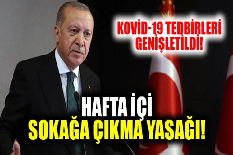 HAFTA SONLARI 24 SAAT YASAKCumhurbaşkanı Erdoğan, sokağa çıkma sınırlamasına ilişkin, "Hafta içi her gün gece saat 21 ile sabah 5 arasında genel sokağa çıkma sınırlaması uygulanacaktır. Hafta sonları cuma akşamı 21.00'den pazartesi sabahı saat 5'e kadar kesintisiz devam edecek. Cumartesi-Pazar artık evlerimizdeyiz." dedi.