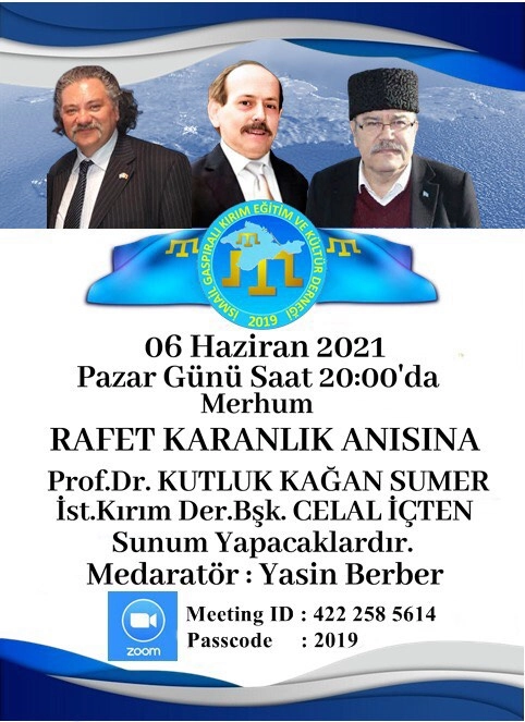 Zoom platformu üzerinden 6 Haziran 2021 Pazar günü saat 20.00'de Prof. Dr. Kutluk Kağan Sümer ve Kırım Derneği İstanbul Şubesi Başkanı Celal İçten'in katılımıyla düzenlenecek anma etkinliğinin moderatörlüğünü Yasin Berber ifa edecek.