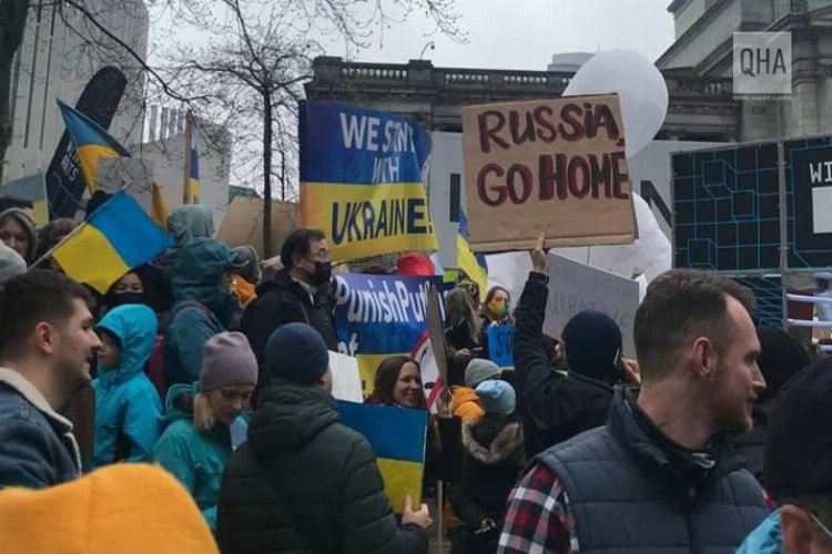 Kanada'nın Vancouver kentinde Rusya'nın Ukrayna'yı topyekün işgal girişimine karşı gösteri düzenlendi. Protestoda, Rus lider Putin ve savaş aleyhinde slogan atıldı.
