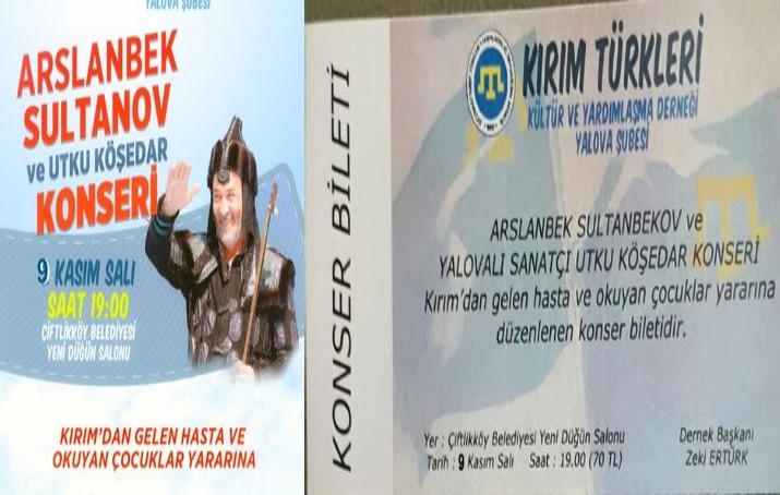 Kırım Türkleri Kültür ve Yardımlaşma Derneği Yalova Çiftlikköy Şubesi, Kırım'dan gelen hasta ve eğitim gören çocuklar yararına 9 Kasım 2021 tarihinde yardım konseri gerçekleştirecek. Konser etkinliği kapsamında, ünlü Nogay Türkü sanatçı Arslanbek Sultanbekov ve Yalova'nın yerel sanatçısı Utku Köşedar sahne alacak. Konser gelirinin Kırım'dan gelen çocukların ihtiyaçlarını karşılamak için kullanılacağını bildiren Kırım Türkleri Kültür ve Yardımlaşma Derneği Yalova Çiftlikköy Şubesi Başkanı Zeki Ertürk etkinliğe dair QHA'ya verdiği demeçte şunları kaydetti: