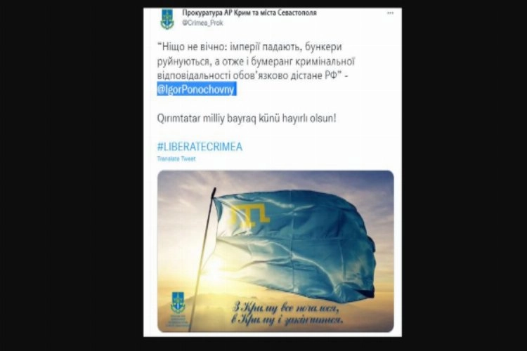 Ukrayna’ya bağlı Kırım Özerk Cumhuriyeti ve Akyar (Sivastopol) Şehri Savcılığı, Kırım Tatar Bayrak Günü nedeniyle yayımladığı mesajda Kırım Tatarca “Qırımtatar milliy bayraq künü hayırlı olsun! (Kırım Tatar Milli Bayrak Günü kutlu olsun)” ifadesini kullandı.