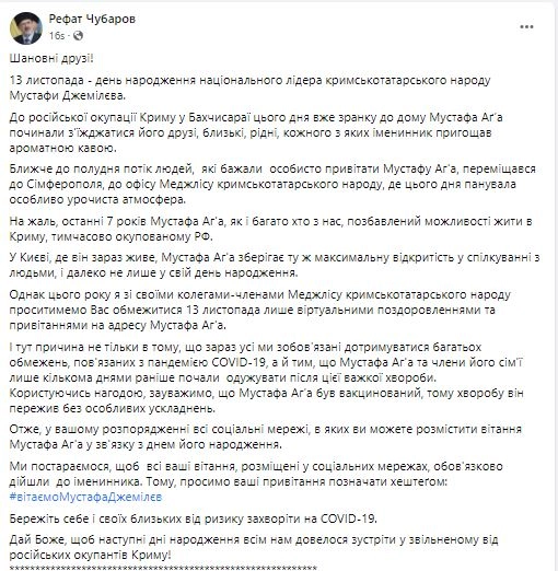 "İNŞALLAH BUNDAN SONRAKİ DOĞUM GÜNLERİNİ RUS İŞGALCİLERİNDEN KURTARILAN KIRIM'DA HEP BERABER KUTLAYACAĞIZ!""Sevgili arkadaşlar! 13 Kasım tarihinde Kırım Tatar halkının milli lideri Mustafa Cemilev'in (Kırımoğlu) doğum günü kutlanacaktır. Genellikle Rusların Kırım'ı işgalinden önce Bahçesaray'da o günün sabahı, arkadaşları, akrabaları ile dostlarının Mustafa Ağa'nın evinde toplanmasıyla başlar ve her birine Mustafa Ağa bizzat mis kokulu bir kahve ikram ederdi. Öğleye doğru, doğum günü münasebeti ile Mustafa Ağa'yı tebrik etmek isteyen insanlardan oluşan gruplar, o gün özellikle bambaşka bir havanın hüküm sürdüğü Simferopol'e (Akmescit), yani Kırım Tatar Milli Meclisi'nin (KTMM) Ofisine akın ederdi. Ne yazık ki, son 7 yıldır birçoğumuz gibi, Mustafa Ağa da, Rusya Federasyonu'nun geçici olarak işgal ettiği Kırım topraklarında yaşama fırsatından mahrum kaldı. Mustafa Ağa ise insanlarla iletişimde, şu anda yaşadığı Kıyiv'de sadece kendi doğum gününde değil, her zaman maksimum açıklığı koruyor. Ancak bu yıl şahsen ben, Kırım Tatar Milli Meclisi üyeleri olan meslektaşlarımla birlikte sizden, değerli arkadaşlar, bu yıl 13 Kasım Günü, Mustafa Ağamız'a hitaben olan tebrikleriniz konusunda kendinizi sadece sanal ortamda gönderilen kutlama mesajları ile sınırlamanızı çok ama çok rica ederim. Bu yöndeki ricamın sebebi, hepimizin COVID-19 pandemisi yüzünden birçok kısıtlamaya uymak zorunda kaldığımız bir durumla sınırlı değil. Aynı zamanda onun sebebi şu ki, Mustafa Ağa ve aile mensupları, geçtiğimiz günlerde geçirdikleri bu ciddi hastalıktan daha yeni iyileşmeye başlamışlardı. Saygılı Mustafa Ağa'nın aşılı olduğunu ve bu sayede hastalığı sorunsuz atlattığını belirtmek isteriz. Böylece, Mustafa Ağa için doğum günü vesilesiyle kendisine nazik tebrik mesajlarınızı gönderebileceğiniz tüm sosyal ağlara sahipsiniz. Biz ise, sosyal ağlarda yayınlanacak olan tüm doğum günü kutlama mesajlarınızın, Saygılı Mustafa Ağa'nın ta kendisine ulaştırılmasını sağlamaya çalışacağız. Bu nedenle, Sizin kendisine hitaben tebrik mesajlarınızı, lütfen, şu hashtag ile işaretleyiniz: #tebriklerMustafaKırımoğlu. Kendinizi ve sevdiklerinizi 'COVID-19' riskinden iyice koruyun.İnşallah, bundan sonraki doğum günlerini Rus işgalcilerinden kurtarılan Kırım'da hep beraber kutlayacağız!"