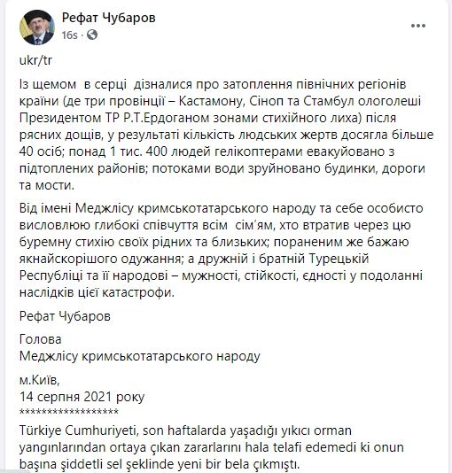Çubarov, sosyal medya üzerinden paylaştığı Türkçe ve Ukraince taziye mesajında, "Türkiye Cumhuriyeti, son haftalarda yaşadığı yıkıcı orman yangınlarından ortaya çıkan zararlarını hala telafi edemedi ki onun başına şiddetli sel şeklinde yeni bir bela çıkmıştı." diye kaydederek, sel felaketinde hayatını kaybedenlerin ve yaralananların haberlerini derin bir üzüntüyle öğrendiklerini ifade etti.