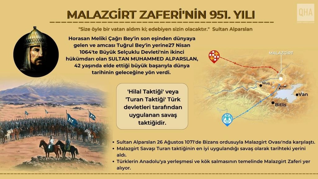 Büyük Selçuklu Hükümdarı Alparslan ile Bizans İmparatoru IV. Romen Diyojen arasında 26 Ağustos 1071 tarihinde gerçekleşen muharebe Alparslan’ın zaferi ile sonuçlandı. Hafızalara kazınan kutlu zaferin bugün 951. yıl dönümü kaydediliyor. Büyük Selçuklu İmparatoru Alparslan tarafından kazanılan Malazgirt Muharebesi sonucunda Türklere Anadolu’nun kapıları açıldı.
