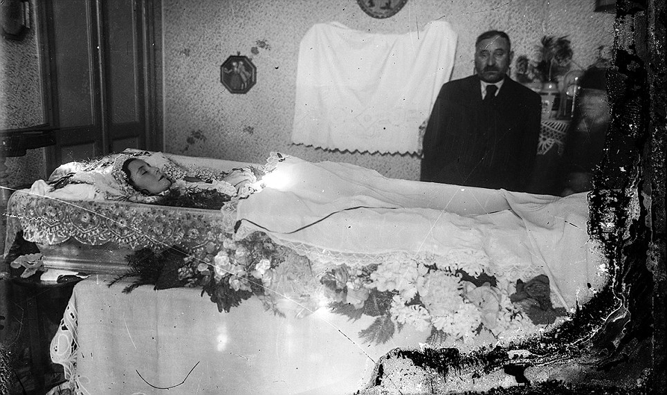 (Romanya'da bir etnografya müzesinden cenaze ritüelleri canlandırması ve 1900'lerden, bir cenaze evinden fotoğraf. Fotoğrafta aynanın örtülmüş olduğu görülüyor.)