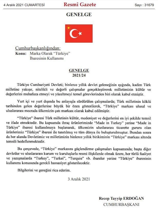 İhraç ürünlerinde, her türlü faaliyet ve yazışmalarda marka olarak "Türkiye" ibaresinin kullanılmasına ilişkin Cumhurbaşkanlığı genelgesi 4 Aralık 2021 tarihinde Resmi Gazete'de yayımlandı. Cumhurbaşkanı Recep Tayyip Erdoğan imzasıyla yayımlanan genelgede, Türkiye Cumhuriyeti devletinin, binlerce yıllık devlet geleneğinin ışığında, kadim Türk milletine yakışır, nitelikli ve değerli çalışmalar gerçekleştirerek milletin kültür ve değerlerini muhafaza etmeyi ve yüceltmeyi temel görevlerinden biri olarak kabul ettiği ifade edildi.
