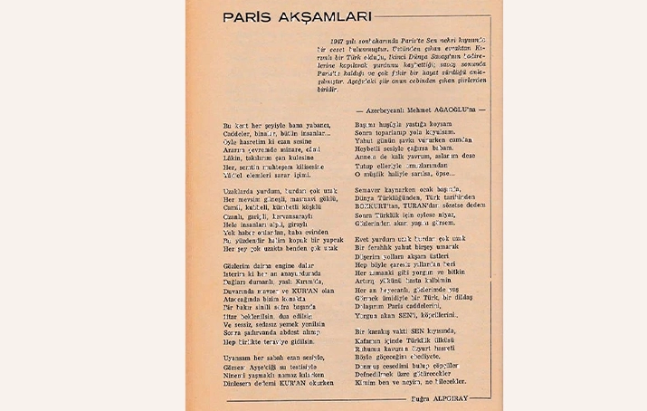 BOZKURT DERGİSİNDE YAYIMLANAN “PARİS AKŞAMLARI” ŞİİRİTürkiye’de 1972 yılında ilk kez “Bozkurt” dergisinin Mayıs sayısında yer alan şiir, Alpgiray tarafından Azerbaycanlı Mehmet Ağaoğlu’na ithaf edilmiş. Dergide yayımlanan şiirin sunuşunda, “1947 yılı sonbaharında Paris’te Sen Nehri kıyısında bir ceset bulunur. Üstünden çıkan evraktan Kırımlı bir Türk olduğu, II. Dünya savaşının bâdirelerine kapılarak yurdunu kaybettiği, savaş sonunda Paris’te kaldığı ve sefil bir hayat sürdüğü anlaşılmıştır. Aşağıdaki şiir onun cebinden çıkan şiirlerden biridir” ifadeleri yer alıyor.