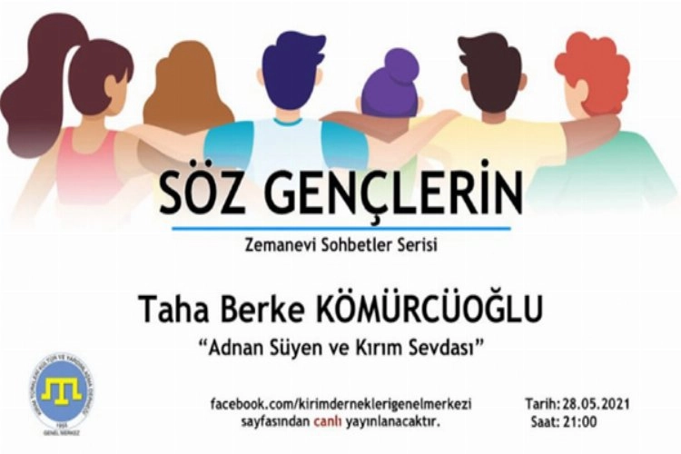 Kırım Derneği Genel Merkezi, 11-17 yaş arası gençlere Kırım sevgisini aşılamak için başlattığı "Söz Gençlerin-Zemanevi Sohbetler Serisi" isimli etkinliğine hız kesmeksizin devam ediyor. Gençlere yönelik programın 28 Mayıs 2021 tarihindeki Cuma günü saat 21.00'deki (TSİ, GMT +3) yayınında Kırım Türkleri Kültür ve Yardımlaşma Derneği Bursa Şubesinin 7 sene önce hayata veda eden merhum Başkanı Adnan Süyen'in hayatı ve mücadelesi ele alınacak. Genç Kırım Tatarı Taha Berke Kömürcüoğlu'nun konuşmacısı olacağı Söz Gençlerin-Zemanevi Sohbetler Serisi’nde bu hafta "Adnan Süyen ve Kırım Sevdası" başlığı konuşulacak .