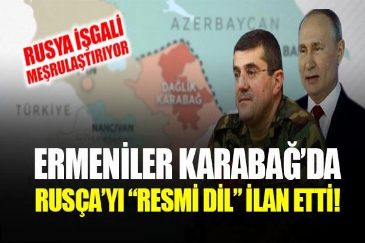 KARABAĞ'DAKİ ERMENİ TERÖRİSTLER RUSÇA'YA "RESMİ DİL" STATÜSÜ VERDİ!Sözde Karabağ Cumhuriyeti, Rusça'ya resmi dil statüsünün verilmesinin, her alanda işbirliğinin derinleştirilmesi için gerekli koşulları yaratacağı ve yasal çerçeve içinde ilişkilerin gelişmesine katkı sağlayacağını ileri sürdü. Tasarı metninde, “Rus barış güçlerinin Karabağ’daki uzun vadeli varlığı, çok sayıda sosyal ve iletişim sorununu birlikte çözme ihtiyacının farkında olunması, inşaat, sağlık, eğitim ve bilim alanlarında iş birliği, Rus dilinin rolünün yeniden değerlendirilmesini gerektiriyor” ifadeleri kullanıldı.