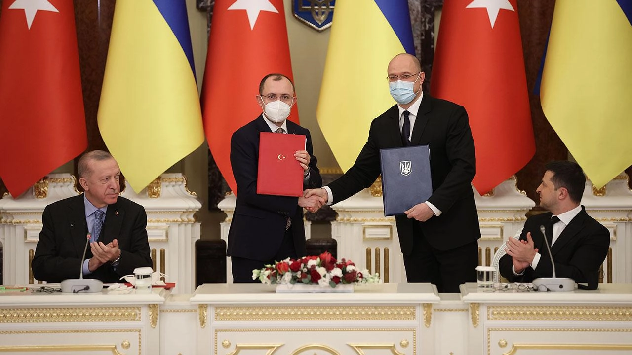 Türkiye Cumhurbaşkanı Erdoğan ve Ukrayna Cumhurbaşkanı Zelenskıy'ın dün gerçekleştirdiği ortak basın toplantısında iki ülke arasında sekiz anlaşma imzalandı. Ukrayna-Türkiye arasında dün heyetler arası toplantıda 8 adet anlaşmaya imza atıldı. İmzalanan anlaşmalar arasında yıllardır merakla beklenen Serbest Ticaret Anlaşması ile İHA'ların üretiminde iki ülke arasında varılan protokolde yer aldı.